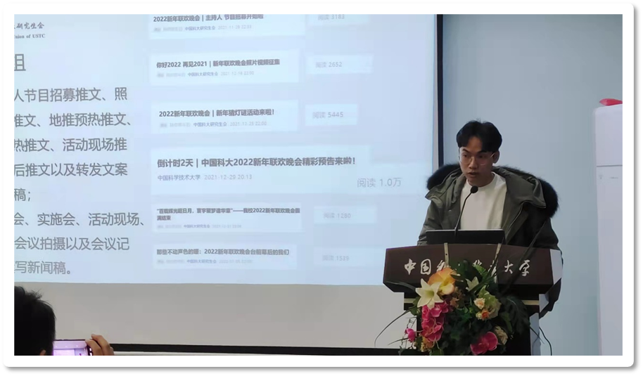 2022年1月6日星期四中午,2022新年联欢晚会项目总结会在中国科学技术大学西区力一楼239召开。校主席团成员陈舫、李昀松,权益服务部部长程淑媛,实践交流部部长南亦宁,项目跟进邱威,项目负责人胡玮怡、李雨蝶以及项目组全体成员出席了本次会议。