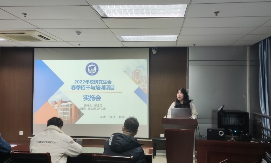 2022年2月22日19:00,2022年校研究生会春季招干与培训项目实施会在东区地空学院教学行政楼702A706会议室顺利召开。校研究生会主席团成员陈舫、委员赵炳露、董少祥、薛兆成、项目跟进委员吴琼、办公室主任贺鹏、宣传部部长陆荷萍、学术科技部部长张劢及项目组各成员参加了本次实施会,负责人毕竹韵因疫情未能出席现场,故会议由张含之代为主持。