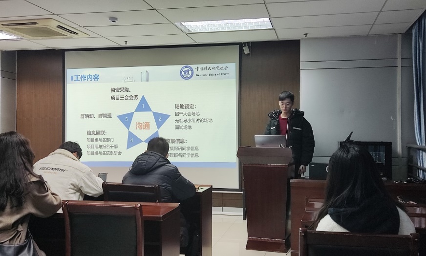 随后,外联组组长吕成亮详细的介绍了外联组近期工作进展,并介绍了下一步工作计划及表达了对组员的肯定。他强调,外联组是本次项目顺利进行的坚强后盾,成员们需要以极强的责任心和执行力,为各组做好后勤保障工作。