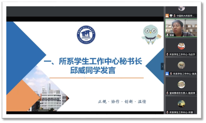 会议第二项,所系学生工作中心主任许清同学做工作汇报。他详细介绍了所系学生工作中心主要工作模块及各部分工作开展情况,表示所系学生工作中心是同学们交流和沟通感情,表达心声和意愿、进行权益维护的重要场所,希望大家对部门工作多提宝贵意见。他鼓励各所系班级同学积极参与到所系学生工作中心及校研究生会举办的各项活动中,希望大家在科大度过精彩难忘的时光。
