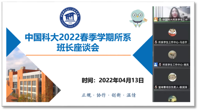 4月13日晚,2022年春季学期所系班长座谈会在腾讯会议室以线上形式顺利召开。学校“全院办校、所系结合”工作委员会办公室副主任夏清泉老师、校心理健康教育与咨询中心崔静琳老师、所系学生工作中心秘书长邱威、各科教融合学院和代培单位代表、校研究生会同学代表及所系学生工作中心同学代表参加了会议。会议由所系学生工作中心副主任肖芬芳主持。