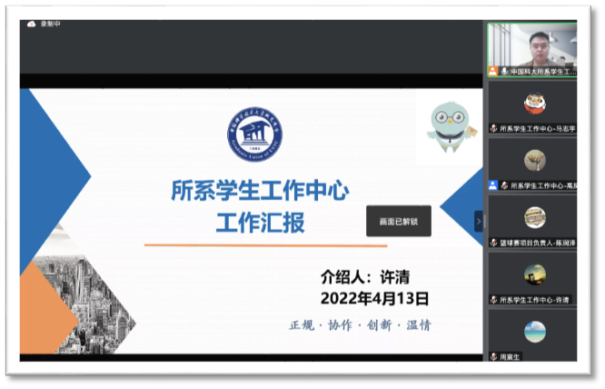 最后,夏清泉老师作了总结发言。他首先代表学校所系结合工作委员会办公室对心理咨询中心崔老师参会并做主题报告表示由衷的感谢。他叮嘱同学们在近期疫情防控趋紧的形势下,一定要严格遵守学校疫情防控各项要求,平安顺利渡过这段特殊时期。他表示,过去一年来,我们开展了丰富多彩的所系学生活动,丰富了同学们在校本部的学习生活。尽管受疫情影响,所系学生工作中心还会继续谋划开展线上活动,希望给大家在科大学习生活的最后时间里留下更多的美好回忆!