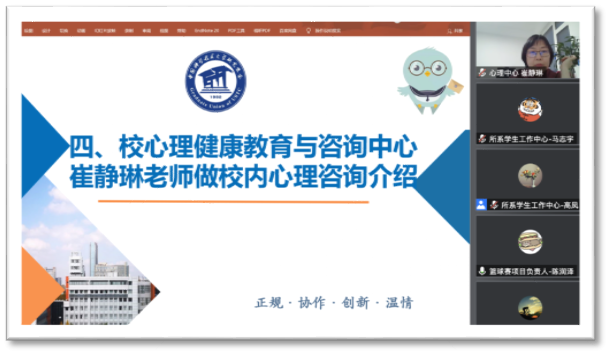 在短暂激动的第一次互动抽奖环节后,校心理健康教育与咨询中心崔静琳老师就疫情防控形势下如何开展学生心理压力舒缓工作做了主题报告,她针对同学们面对不同的心理状况可采用不同的自我调适及外部援助方式作了解答,如心理波动不大时可以采用运动、冥想、正念等方式进行自我调适,在自己不能解决时可以寻找心理治疗师、心理咨询师等的外部援助。她建议同学们可以通过稳定作息、规律饮食、保证睡眠及坚持运动等方式保持一个健康积极的心理状态。此外,她还对学校心理咨询中心及预约流程进行了介绍,对已开展的活动如专业培训与讨论、心理团体活动等进行了分享。