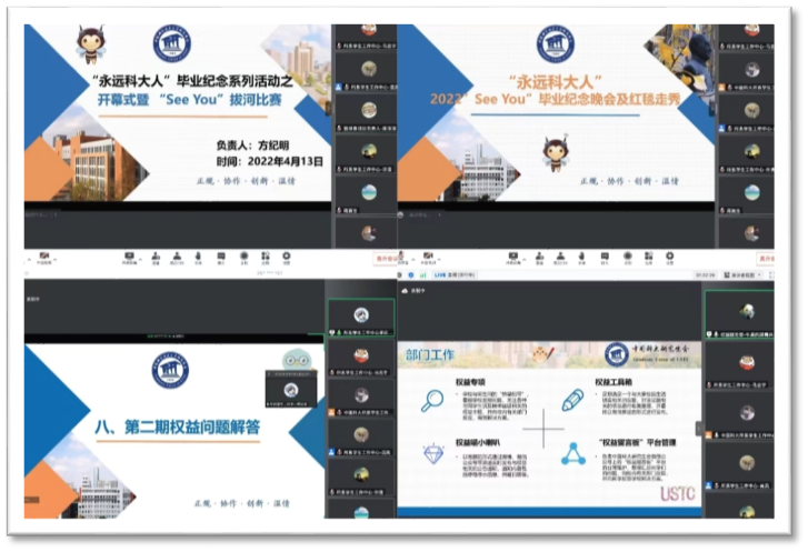 会议第五、六项,所系学生工作中心及校研会项目预热。首先所系篮球赛项目负责人陈润泽同学介绍了所系篮球赛的相关细节,并表示将根据学校的疫情防控政策确定比赛具体时间。随后校研究生会方纪明同学及吴燕珍同学分别对2022“永远科大人”毕业纪念系列活动中的开幕式暨“See You”拔河比赛项目、“See You”毕业纪念晚会及红毯走秀项目进行了介绍,他们回顾了往年活动的精彩瞬间,并指出所系同学历来是毕业纪念系列活动的参与主力之一,希望各所系班长可以号召班级同学积极参加。