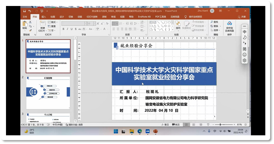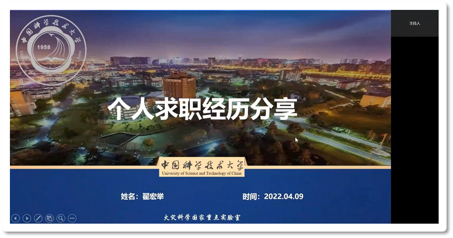 2022年4月9日及10日晚,中国科学技术大学火灾科学国家重点实验室2022年“Meeting and Sharing”求职就业分享会成功举行。本次分享会由火灾科学国家重点实验室研究生会及新闻中心联合承办,活动采取线上方式开展,邀请了八位优秀校友以及优秀应届毕业生,两场会议共吸引了四百多名同学的热情参与。