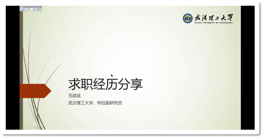 最后一位嘉宾是实验室2021届博士毕业生毛斌斌师兄,毛斌斌师兄入职武汉理工大学,他的分享内容是:找工作的一些流程和建议、撰写简历的建议以及国外博后机会寻找建议等。