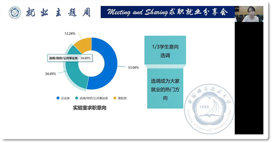 祝玉泉老师发言结束,2022年“Meeting and Sharing”求职就业分享会正式拉开帷幕。首先,火灾科学国家重点实验室研究生会实践交流部的阳亚红同学和汤霄杰同学介绍了实验室历年毕业生就业情况,这让与会同学们对实验室毕业生求职就业方向有了更清晰的认识。