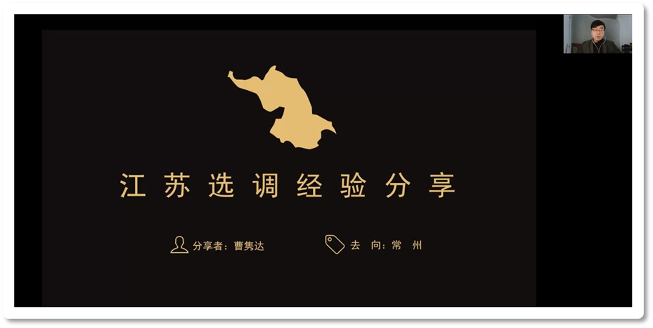 正式进入分享环节后,第一位分享嘉宾是实验室2021届硕士毕业生曹隽达师兄,曹隽达师兄考取了江苏省常州市名校优生选调,他的分享内容是:江苏名校优生选调经验分享,其中对江苏选调生基本情况、报考准则以及复习计划作了详细说明。