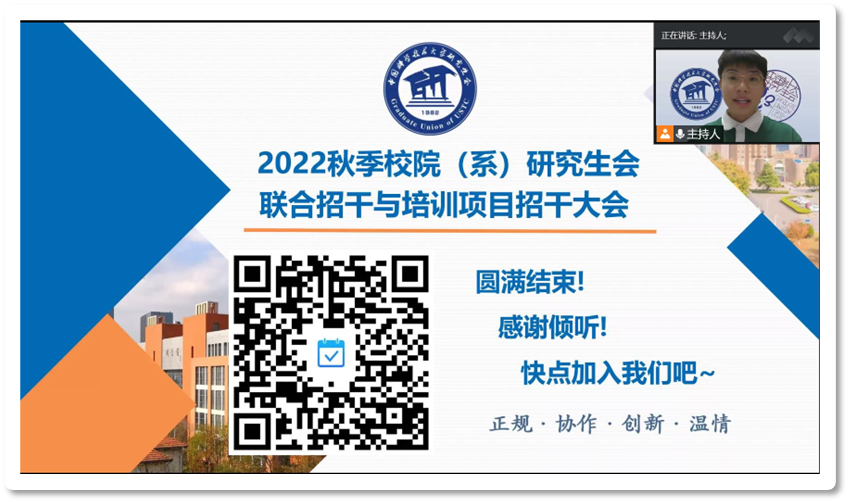 答疑结束后,招干大会进入了今天的最后一个环节,院系研究生会开展线上招新介绍。管理学院研究生会代表韩金朵、国家同步辐射实验室及核科学技术学院研究生会执行主席杨茜雅、合肥微尺度物质科学国家研究中心研究生会代表高远翔、先进技术研究院研究生会代表秦莜懿,分别从组织构架、部门职能、工作概况、骨干培养等方面生动形象地展现了各自学院的特色和风采,并欢迎各位同学的到来和参与。自此,本次2022校院(系)研究生会秋季联合招干与培训项目招干大会圆满落下帷幕。
