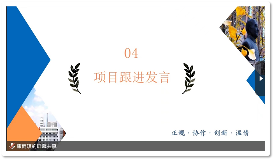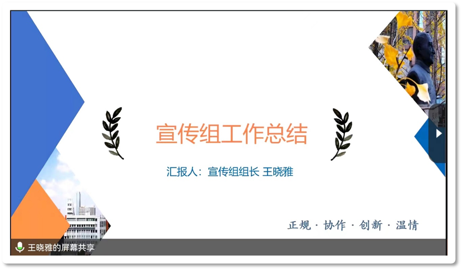 随后,各职能小组进行了总结汇报。策划外联组组长康雨琪对项目实施过程中的策划和外联工作进行了回顾总结,并详细地介绍了秋招日程安排、招干大会、无领导小组讨论及面试的情况。同时她也针对各个活动,提出了自己的看法,期望能给未来的招新工作提供借鉴。最后,她对项目组的每位成员的努力表示感谢。
