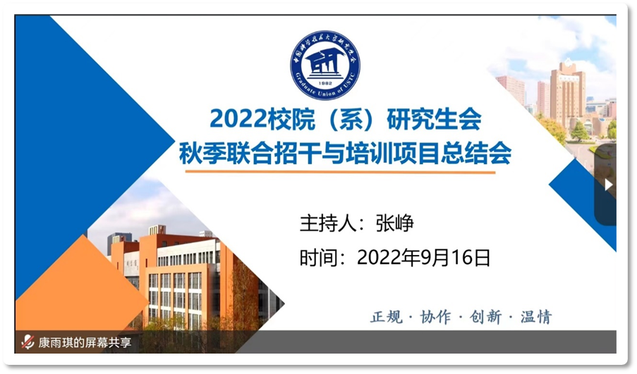 2022年9月16日晚21:00,2022年校院(系)研究生会秋季联合招干与培训项目总结会通过腾讯会议在线上成功召开。出席会议的有主席团成员吴琼、项目跟进赵炳露、办公室主任陈至伟、人力资源部部长赵佳恒、宣传部部长毕竹韵、学术科技部部长黄庭雅、权益服务部部长胡玮怡、实践交流部部长王宁薇、项目负责人张峥以及全体项目组成员。本次会议由项目负责人张峥主持。
