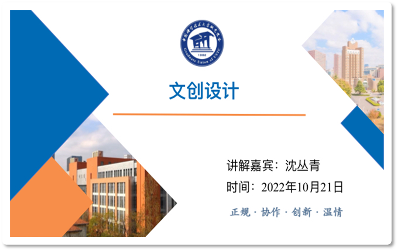 首先,由沈丛青师姐由实际设计案例,即以科大东区专家公寓的院士之家为出发点,首先给大家呈现了该设计的整体情况,之后向大家讲述了自己的灵感来源,并以“创”为关键字,分享了一些做文创设计前的知识与资源获取的途径,从而提出了“创意无界”的重要性。在同学们对前期准备有了些了解之后,师姐又帮助大家学习如何入手去做一个文创设计的课题,学习方法之余,我们又通过师姐对专业思维与商业思维的分析对文创设计有了更深的理解。最后,丛青师姐还给我们分享了她们工作室的许多精美的文创设计的成品,同学们也非常积极地参与到答疑环节中。