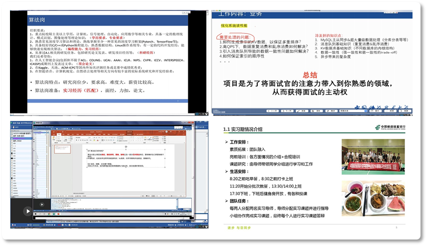 11月20日晚,首先是现任职于集成所人机控制中心沈柁孜学长分享了算法方面的经验,介绍了需要学习理论知识,阅读开源框架代码,思考idea,修改框架以及面试经验。软件学院数据智能实验室的在读博士张晨学长解答了同学们算法实习,项目论文,读博规划等多个问题,参会的同学们积极在讨论区参与了讨论。现就职于杭州网易胡建学长介绍了算法岗的基础,实习,论文,秋招,进行了详细的分享。接着是后端部分,两次实习于字节跳动的张茂森学长进行了23秋招就业的分享,包括面试准备,工作内容,学习路线,工作待遇等。最后,就职于邮政储蓄银行合肥分中心的杨希予学姐带来关于银行工作方面的优质分享。