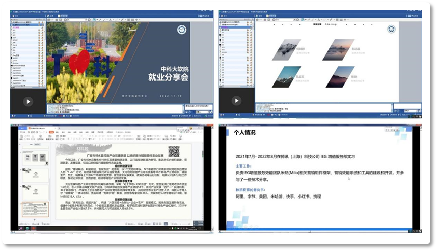 11月19日晚,两位学长学姐分别来自安徽省高级人民法院,四川省遂宁市委组织部,还有两位是软件学院20级的学长学姐。分享会上,何婷婷学姐和彭志磊学长分别介绍了选调方面的情况包括报考规划,笔试,面试,以及个人工作体验和感悟。前端方向,孔文玉学姐,张琳学长分享了在腾讯,字节等众多大厂的实习、面试经验,笔试,面试,项目、简历的准备。学长学姐们现场解答了同学们的提出问题,并提供了关于学习和实习就业多方面的建议。