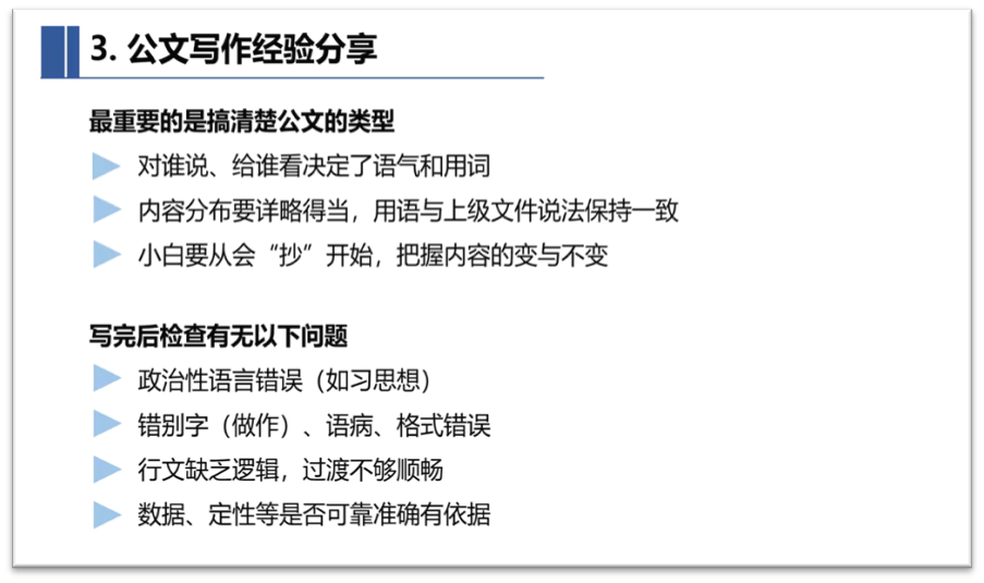 接下来,王睿师兄向同学们分享了公文写作的经验。指出要明确公文的类型,把握好语气、用词和详略等内容。在写作完成后,要注意检查用词、格式、行文逻辑和过渡等内容,还要确定数据、定性是否可靠、准确和有依据。最后,王睿师兄举出了典型的案例,详细地带领我们体验了公文修改的流程。