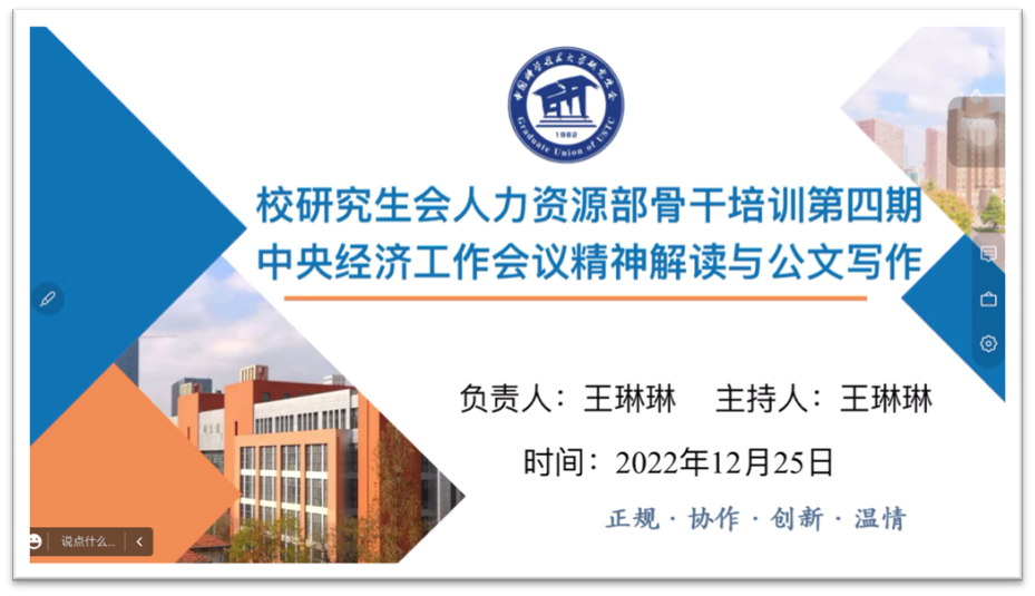1225日下午15002022-2023学年第一学期校研究生会第四期骨干培训在腾讯会议举办。培训内容包括中央经济工作会议精神解读和公文写作技能,本次培训邀请了科大校友,现就职于国家发改委的王睿担任主讲嘉宾。来自校研究生会、校学生会、社团管指委、院(系)直属研究生会等学生组织的77名学生骨干参加了本次培训。本次培训由校研究生会人力资源部骨干王琳琳主持。