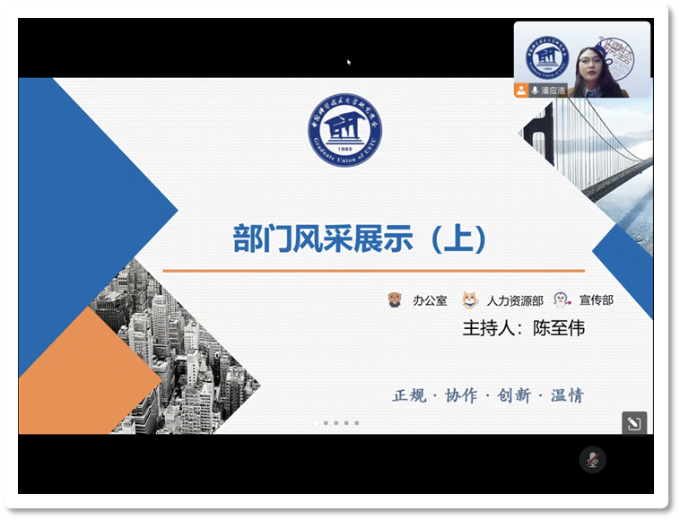 接下来是针对研会介绍的提问环节,主持人陈至伟回答了线上同学们的疑问。随后,七个职能部门依次给大家进行风采展示。部门风采展分上半场和下半场。上半场,由办公室主任陈至伟、人力资源部部长赵佳恒、宣传部部长毕竹韵分别对所在部门进行介绍。下半场由学术科技部部长吴燕珍、权益服务部部长胡玮怡、实践交流部部长朱铭毅、所系学生工作中心主任宋稚豪进行各自部门的介绍工作。