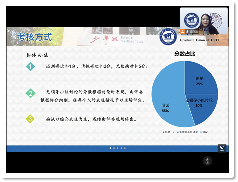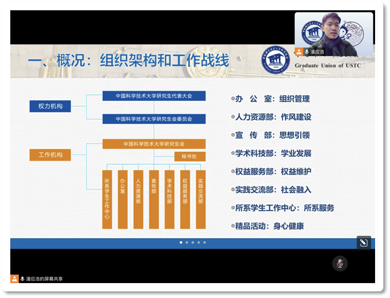 各部门和中心的负责人分别从职能定位、工作模块、成员介绍和人才招募四个板块介绍了各自所在部门和中心,并各具特色地展现了研会风采。风采展示结束后,来到了针对各部门的自由提问环节。同学们对感兴趣的部门提出疑问,对应负责人即刻回答,增加了会议的互动性,也让报名春招的同学更加深入地了解了校研究生会。