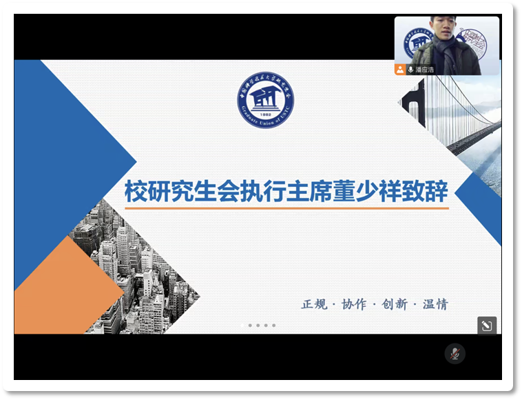 会议如火如荼地进行着,董少祥主席再次登场,为大家带来了校研究生会的简介,主要包括组织架构和工作战线两部分。他对研会的权力机构和工作机构进行了拆分讲解;并从组织管理、作风建设、思想引领、学业发展、权益维护、社会融入、所系服务和身心健康八个方面全方位地讲解了校研究生会的工作战线,展示了校研究生会丰富多彩的部门项目和崇高的校园责任感。最后,董少祥主席期待与大家在校研究生会相知相遇,共同谱写美好的未来。