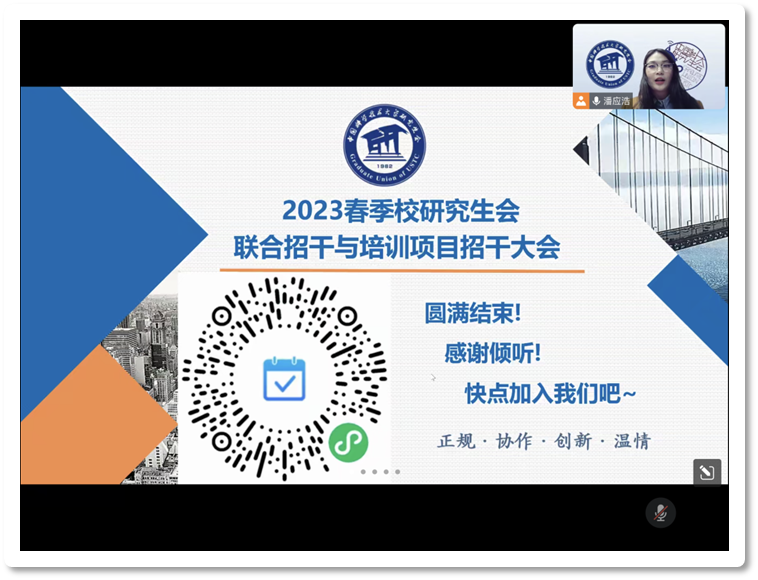 最后,在主持人陈至伟的宣布下,中国科学技术大学研究生会2023年春季招干大会圆满落下帷幕。她祝福大家能够在未来书写属于自己的精彩篇章,也相信校研究生会因为新同学的加入,一定会翻开崭新的一页。