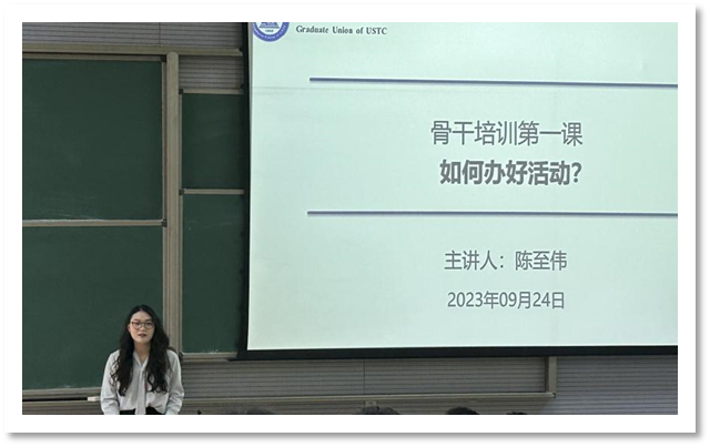 会议第五项,校研究生会主席团成员陈至伟主讲骨干培训第一课。培训以如何办好活动为主题,相比较具体的技能提高,她强调新骨干们更需要学习如何把握好活动脉络。她指出作为活动负责人需要明白为什么办活动,了解服务对象的需求。以“美丽邂逅”活动为例,她介绍了项目地点的挑选技巧和要求,需要根据项目选择地点,大胆创新,小心求证;随后,她分析了在活动实时的推进过程中存在的注意事项,提出作为负责人应做到分工合理明确,工作量均匀,做到策划详细,专人专事,责任到人;最后,她强调了应急预案的重要性,遇到突发事件需提供实际可行的解决办法,舍远求近。