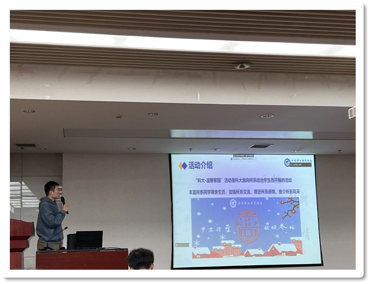 会议第一项,项目负责人桑宏川同学介绍了项目整体工作计划以及今年活动策划中形式上的创新点。他表示温馨家园项目作为中国科大研究生会的经典品牌项目,希望今年能继续在项目组全体成员的共同努力下越办越好!