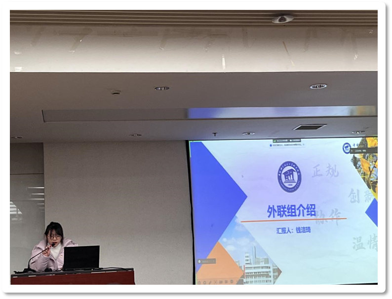 会议第二项,各职能小组组长分别对本组情况进行了介绍,策划组组长徐士博从目前完成工作情况、人员分工及工作进度等方面进行了汇报;宣传组组长徐景涛从人员组成及组内分工,各项宣传工作计划等进行了汇报;外联组组长钱洁琦从人员介绍、工作分组、时间节点和工作内容四部分进行了介绍,并提出要打造“项目温馨、团队暖心、你我欢欣”的工作氛围。