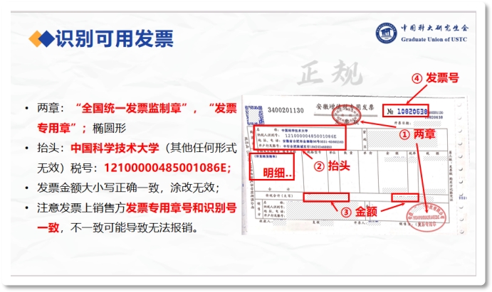 随后,在本次培训的第二部分,来自办公室的朱婕同学和特邀嘉宾桑宏川同学为大家开展了研究生会财务相关的培训。他们主要讲解了如何识别可用发票、财务报销流程、报账所需材料等财务相关的知识细节,并且通过图片和流程图,形象地帮助同学们了解了财务知识的研究生会内部财务报销的整体流程,为同学们日后的工作打下坚实的基础。