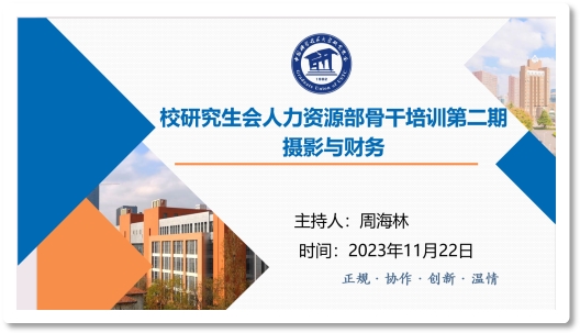 培训内容为摄影技术讲解以及研会内部财务培训,本次培训邀请了校学生摄影协会会长胡炜博同学、校研究生会办公室朱婕同学和实践交流部的桑宏川同学担任主讲嘉宾。来自校研究生会、社团管指委、院(系)直属研究生会等学生组织的近百名学生骨干参加了本次培训,本次培训由校研究生会人力资源部副部长周海林同学主持。