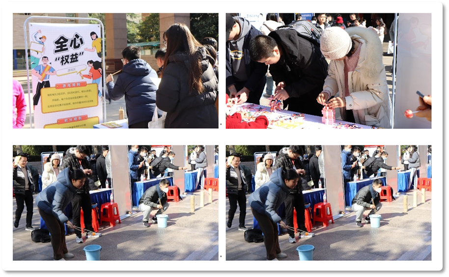 本次地推活动游戏区共有全心“权益”(投壶游戏)、“权益”无穷(积木游戏)、“权益”传递(运球游戏)和“权益”乐猜(你比我猜)四个游戏,同学们通过现场组队完成这些游戏任务,以获得积分印章并兑换奖品。游戏过程中的互动在无形中增强了同学们之间的友谊和默契,让同学们在游戏中收获了更多的快乐。