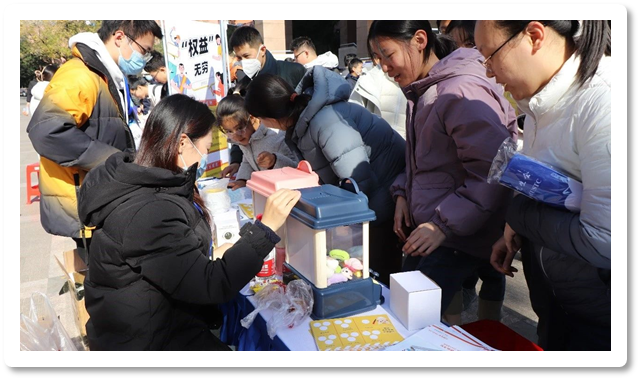 本次地推活动游戏区共有全心“权益”(投壶游戏)、“权益”无穷(积木游戏)、“权益”传递(运球游戏)和“权益”乐猜(你比我猜)四个游戏,同学们通过现场组队完成这些游戏任务,以获得积分印章并兑换奖品。游戏过程中的互动在无形中增强了同学们之间的友谊和默契,让同学们在游戏中收获了更多的快乐。