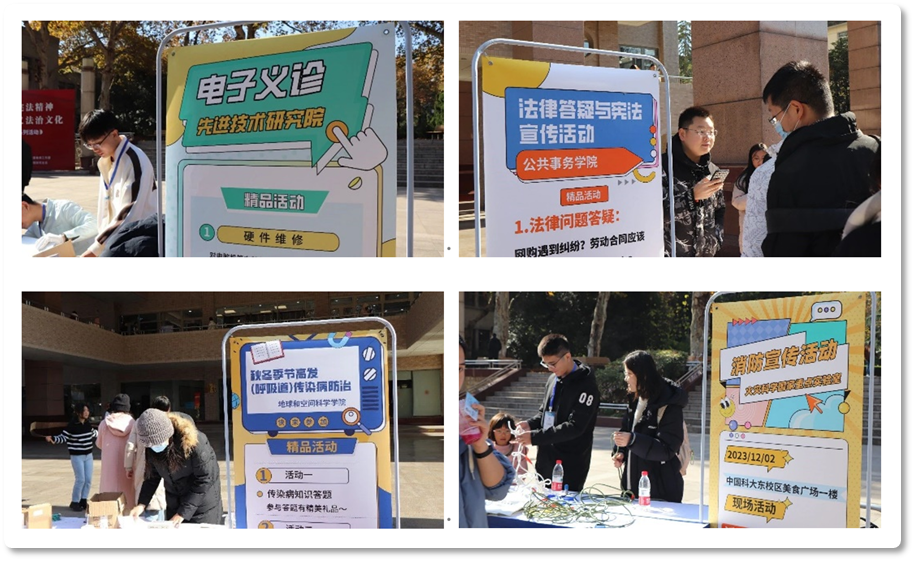 在院系服务区中,各参与院系结合自己的学科特色,以丰富的活动形式,为参与的同学们提供了一系列服务。其中,先进技术研究院研究生会主要为同学们提供电脑维修服务,包括硬件维修、软件维修等,并协助同学对硬盘、U盘上近期误删的文件进行数据恢复。公共事务学院研究生会则召集了高分通过全国法律资格考试(法考A证)的优秀同学进行现场答疑,为大家的各种法律问题给出较为专业的解答,并通过宪法知识趣味答题,进一步宣传宪法知识,弘扬宪法精神。除此之外,地球和空间科学学院研究生会通过举办传染病知识答题、“八段锦”动作学习和医疗义诊活动,让参与同学得以更深入地了解并预防秋冬季节高发(呼吸道)传染病。火灾科学国家重点实验室研究生会则通过结绳自救和灭火器使用教学,让同学们学习到了一些重要的安全技能,以应对紧急情况。