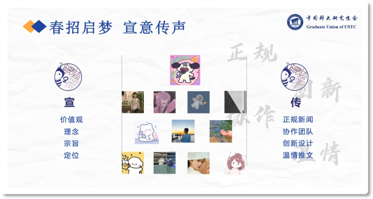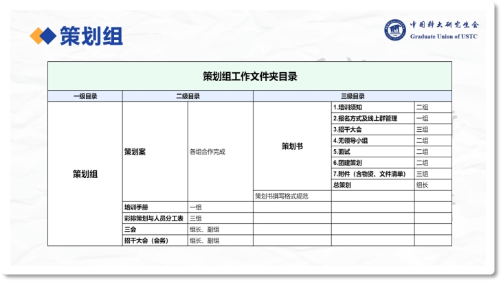 紧接着,各小组组长分别详细介绍了各小组的具体情况和工作安排。策划组组长汤寒冰以“工作文件夹目录”为框架系统地梳理了本组的工作内容,明确了关键的时间节点。宣传组组长钱洁琦提出宣传组标语为“春招启梦,宣意传声”,以研会价值观为出发点,将本组工作分为“正规新闻、协作团队、创新设计、温情推文”四大板块,同时对各板块的工作计划进行了汇报。最后,外联组组长谷迪声介绍了本组分工,对年前、年后各小组在场地预定、QQ群运营、对外联络、物资采买等重点工作领域进行了讲解。