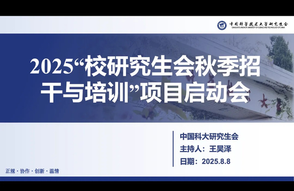 2025年9月11日,2025“校研究生会秋季招干与培训”项目之招干大会在中国科大研究生会哔哩哔哩直播间拉开帷幕。校研究生会执行主席钱洁琦、校研究生会主席团成员、各部门部长、联合招干的各院级研究生会代表以及全体项目组成员出席了本次会议。本次招干大会共吸引350人次参与。大会伊始,由校研究生会执行主席钱洁琦致辞,并对校研究生会整体情况进行了介绍。随后,主持人王昊泽详细介绍了秋招的具体日程与考核方式,并对无领导小组讨论、面试等环节的规则进行了详细解读,确保每位面试者都充分了解面试流程。接着,中国科大研究生会七大部门依次向大家进行部门风采展示。最后,参与联合秋招的工程科学学院研究生会、公共事务学院研究生会等8个院级研究生会进行宣讲。