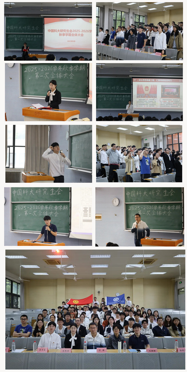 2025年9月20日,中国科大研究生会举办了2025-2026学年秋季学期全体大会,出席大会的有校团委书记、校研究生会秘书长千坤老师,校团委副书记刘珊珊老师及校研究生会全体成员。会议由校研究生会执行主席钱洁琦主持。会议第一项,奏唱国歌。在嘹亮的国歌声中,大会拉开帷幕。会议第二项,校研究生会主席团成员陈思燕致辞,她代表中国科大研究生会向新加入的骨干们表示热烈的欢迎、由衷的欣喜和深切的期待。会议第三项,校研究生会主席团成员王雨婷以《格物沿途,群英荟萃》为主题介绍校研究生会总体情况。会议第四项,校研究生会主席团成员李子豪领誓,重温入团誓词。会议第五项,校研究生会主席团成员谷迪声就如何办好项目分享经验。会议第六项,校团委书记、校研究生会秘书长千坤老师做总结发言,充分肯定了校研究生会在过去一年在工作中取得的成果,并鼓励同学们积极发挥主观能动性,始终秉持全心全意为同学们服务的宗旨,从同学中来到同学中去,了解同学诉求,做好桥梁纽带的作用。会议第七项,奏唱校歌。伴随着“高峰要高到无穷,红旗要红过九重”的激昂旋律,2025-2026学年秋季学期全体大会落下帷幕。