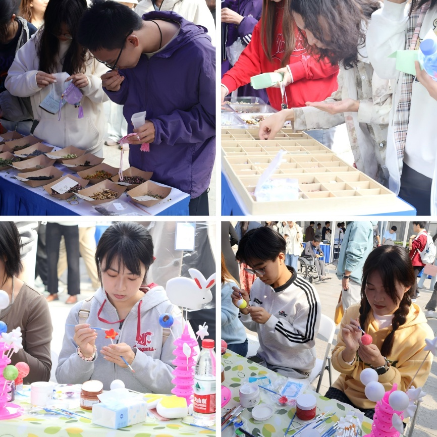趣味互动,点亮金秋时光。同学们或在秋日手作系列摊位全情投入,体验非遗魅力;或精心制作手工串珠与DIY养生香包,或在“蓝晒书签”摊位利用阳光创作艺术书签。